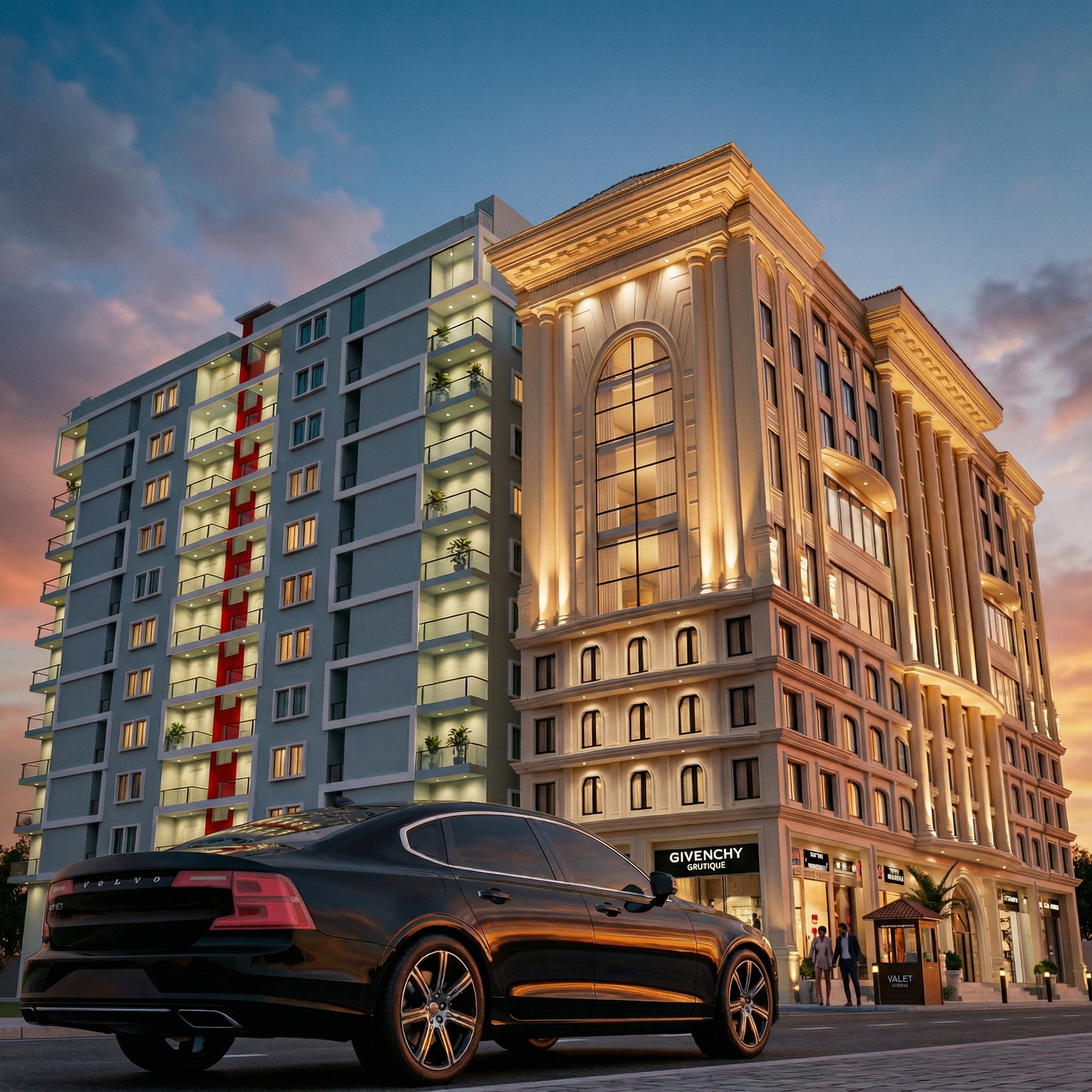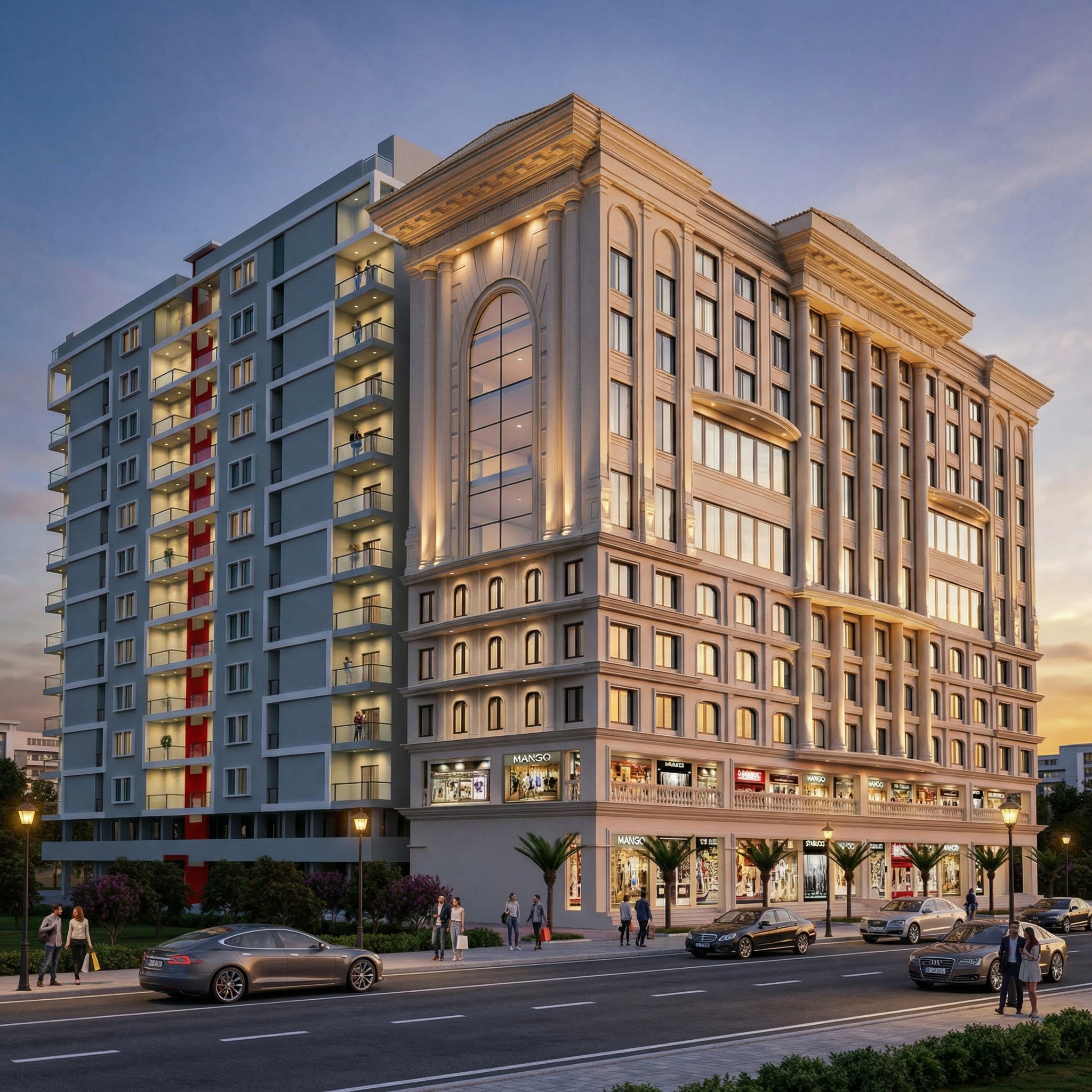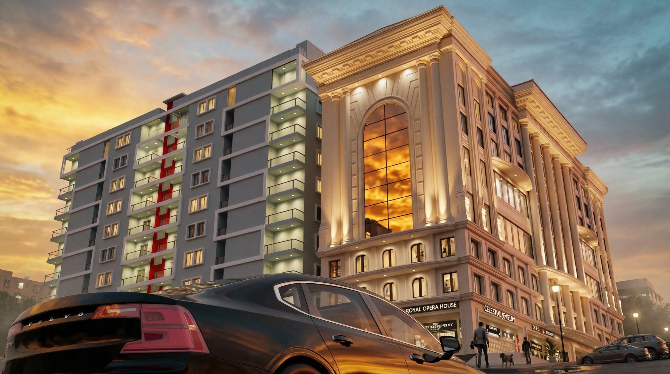 Spread across a prime location, the project is designed with a building structure of Ground + Parking + 8 floors, comprising 100 thoughtfully designed residential flats along with 8 commercial shops that ensure convenience for residents.