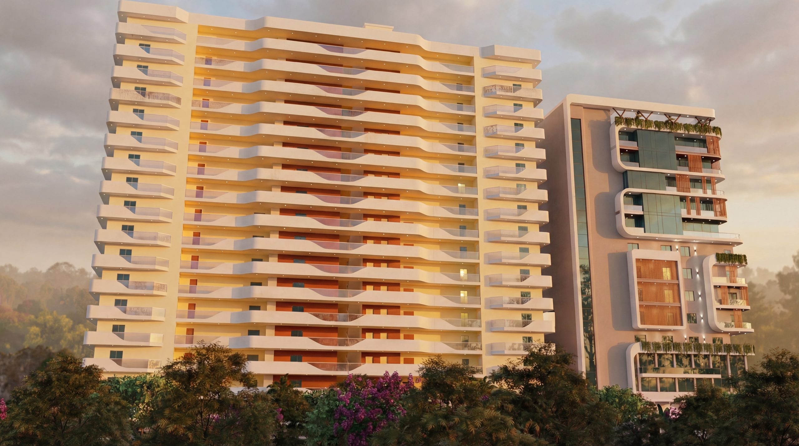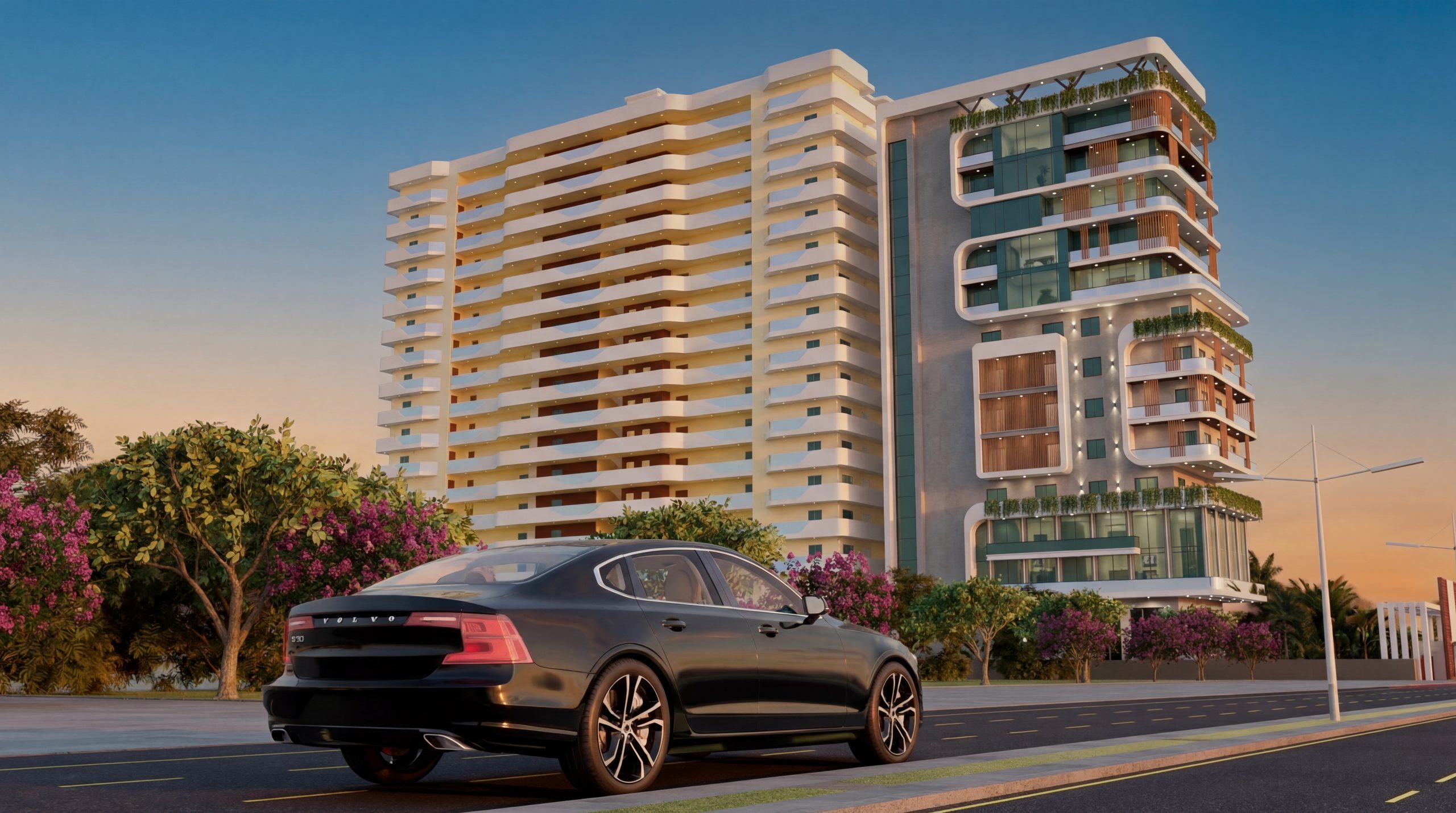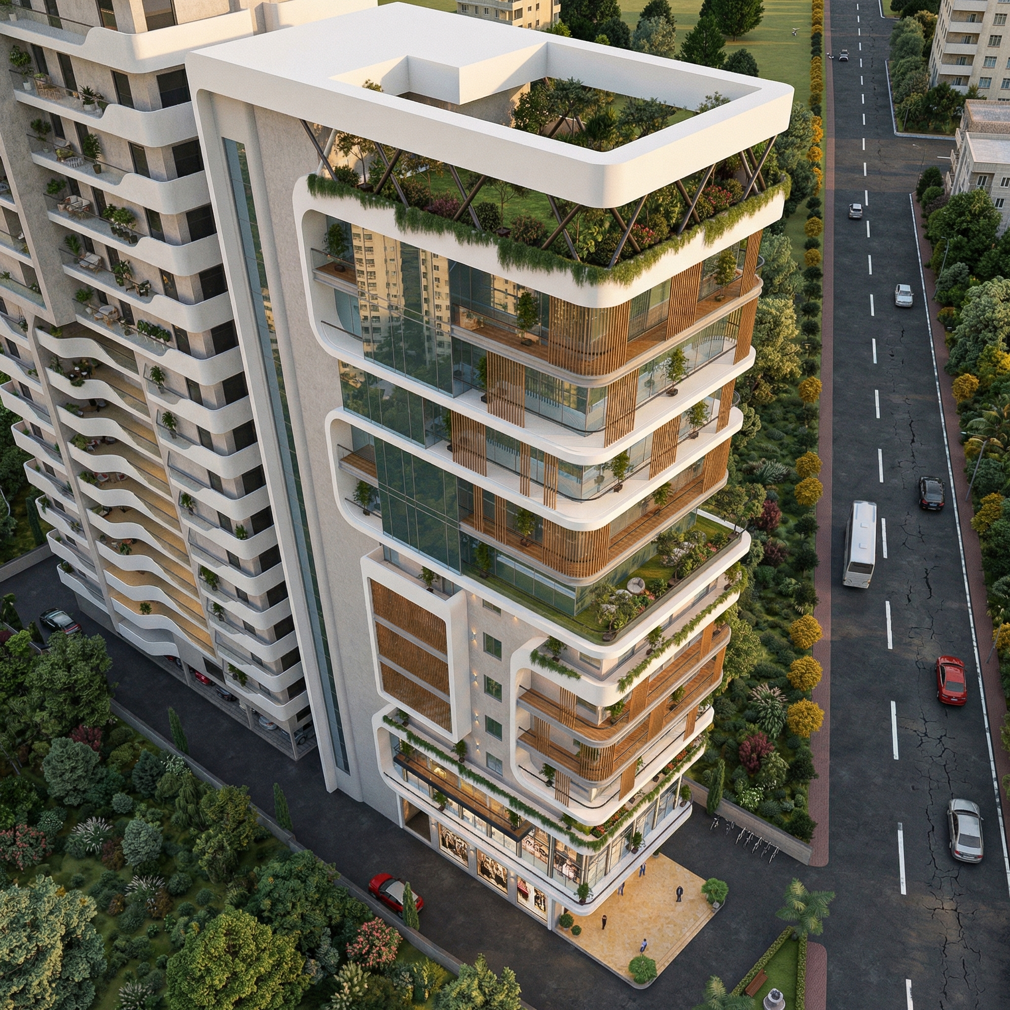 The commercial tower rises to G+P+6 floors, offering 12 high- street showrooms, 30 state-of-the-art office spaces, 2 modern banquet halls, 2 luxury hotels, and a rooftop restaurant.