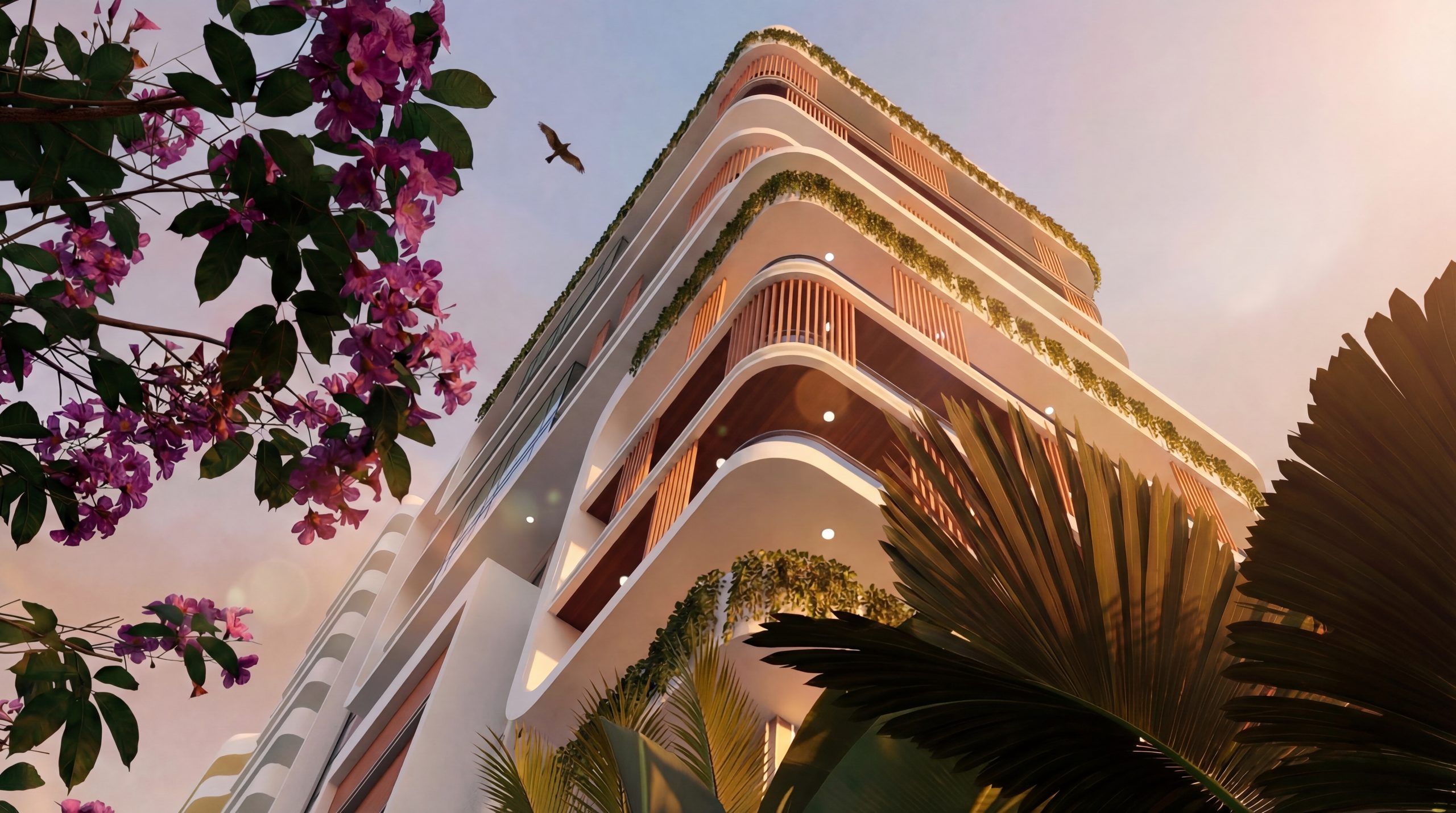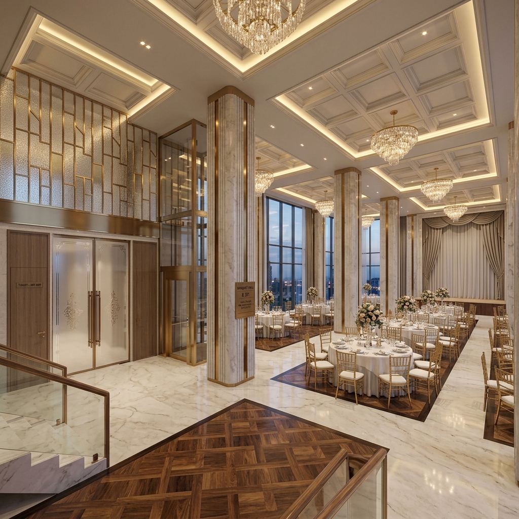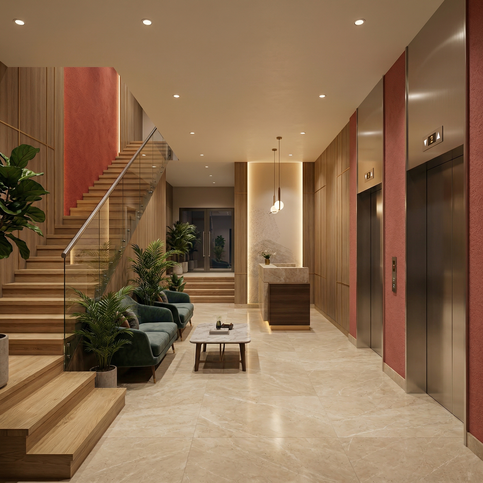 The commercial tower rises to G+P+6 floors, offering 12 high- street showrooms, 30 state-of-the-art office spaces, 2 modern banquet halls, 2 luxury hotels, and a rooftop restaurant.